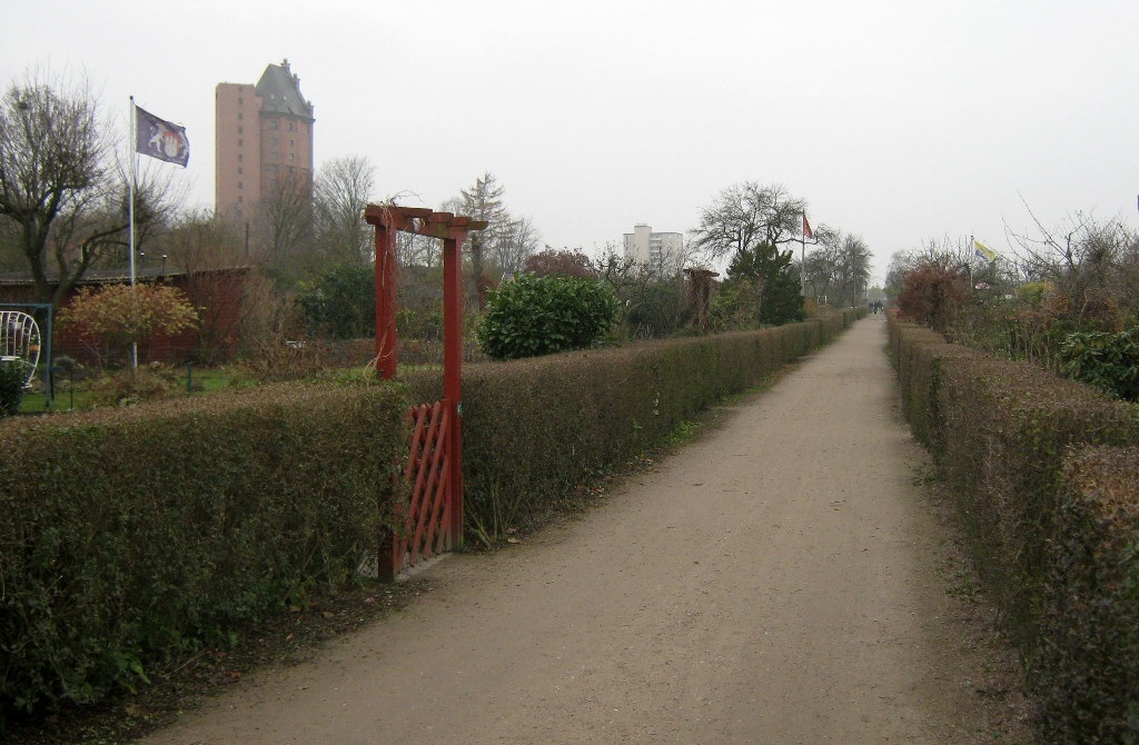 Ein anderer Hauptweg des Kleingartenvereins Friedrichstal mit dem Hochhaus an der Kieler Straße