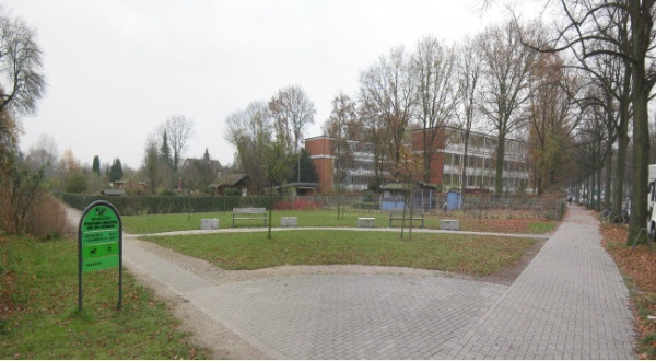 Ein Eingang vom Bollweg aus, gegenüber ist der andere Eingang mit einem kleinen Parkplatz